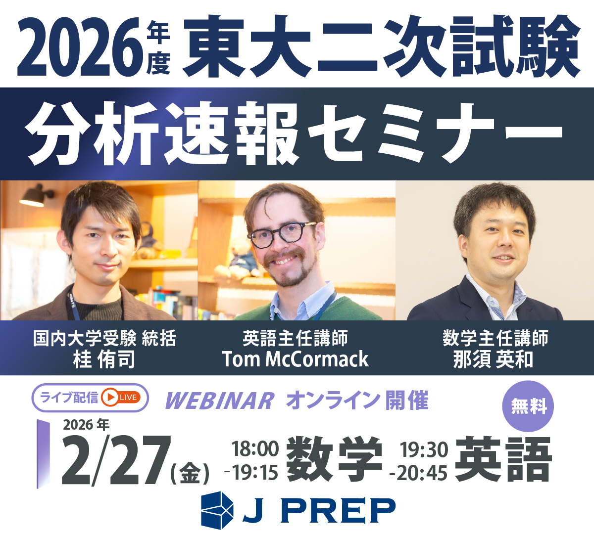 J PREPは、2月25日(水)・26日(木)に実施される東京大学二次試験の英語・数学問題を解析・解答した上で、2月27日(金) 18:00から、「東大二次試験 問題分析速報セミナー」無料ウェビナーを開催します。